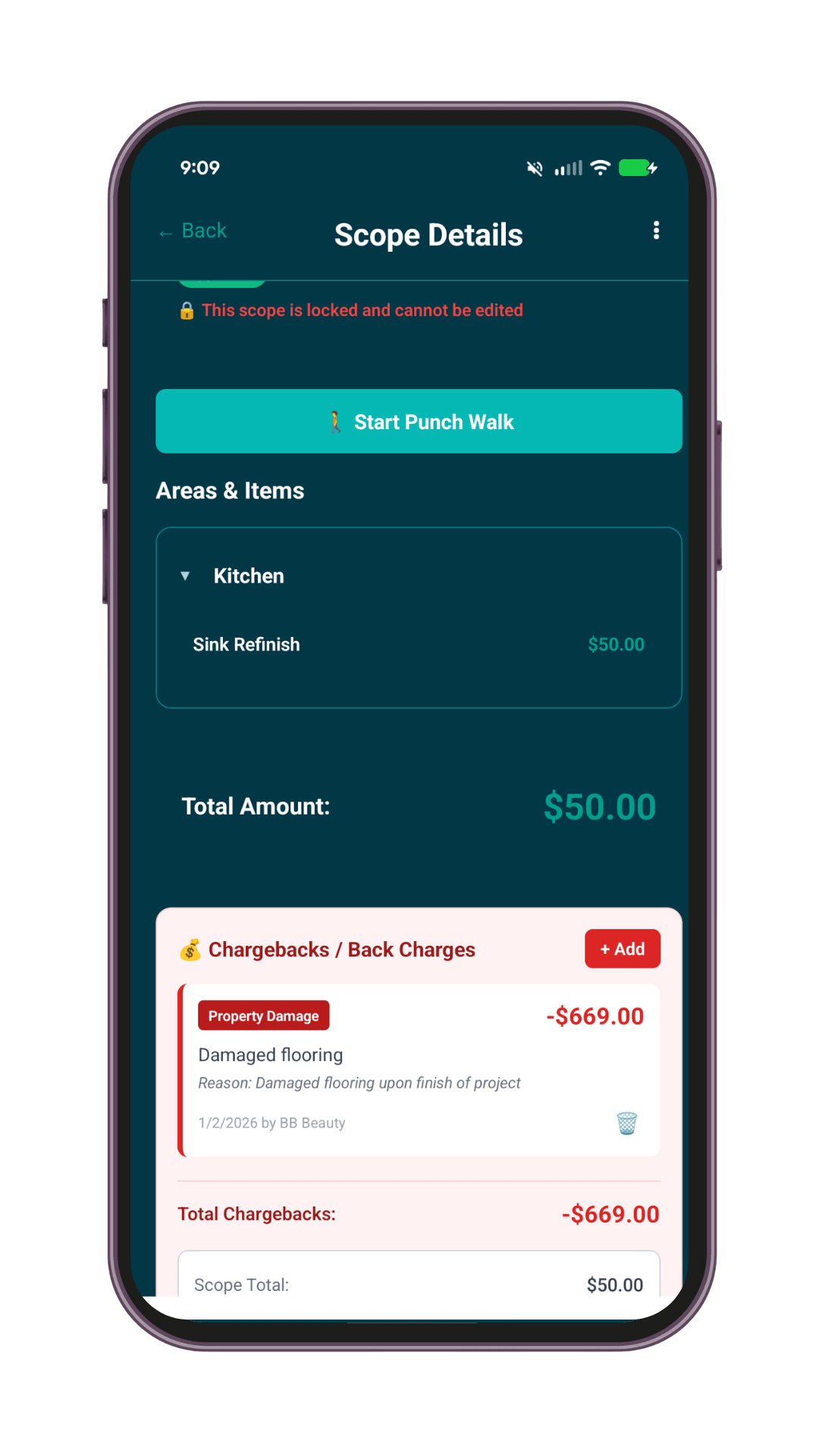 Conduct punch walks, verify work, and approve/reject with notes. Professional scope management at your fingertips.